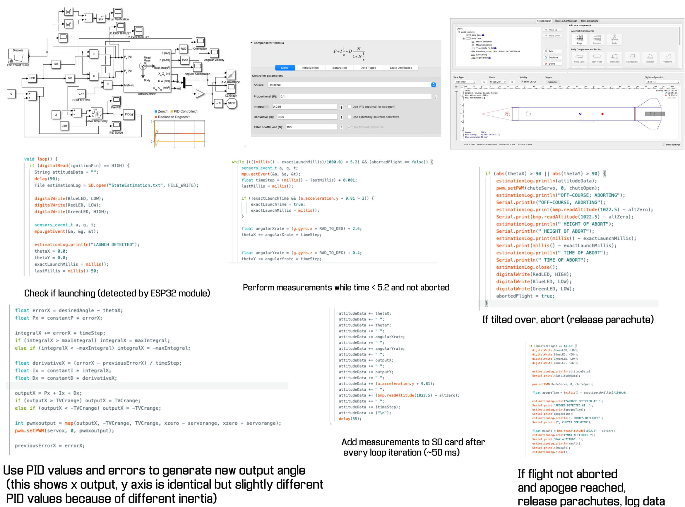 BPS.space introduced me to OpenRocket (top right). I used it to find the best mechanical parameters for Ursus: nosecone and fin shape, body tube length, and avionics placement. OpenRocket predicted a 128m apogee around 5 seconds after launch and a max acceleration of almost 6 G’s using an E-35 Questjet rocket motor.BPS.space also showed me how to use MATLAB’s Simulink tool (top left) to tune PID values for the control algorithm. Plugging in my rocket’s moment of inertia (obtained through hanging tests), mass, and the E-35 thrust curve allowed me to simulate flights in X and Z space. I added a servo time delay function to make my simulation more realistic.I coded the Teensy in the Arduino IDE. The main loop checks to see if the ESP32 camera module received a signal to launch (over ESP-NOW) before starting to measure angles and stabilize the rocket (waiting until launch to start the IMU reduced sensor drift). I spent weeks refining and testing my code.