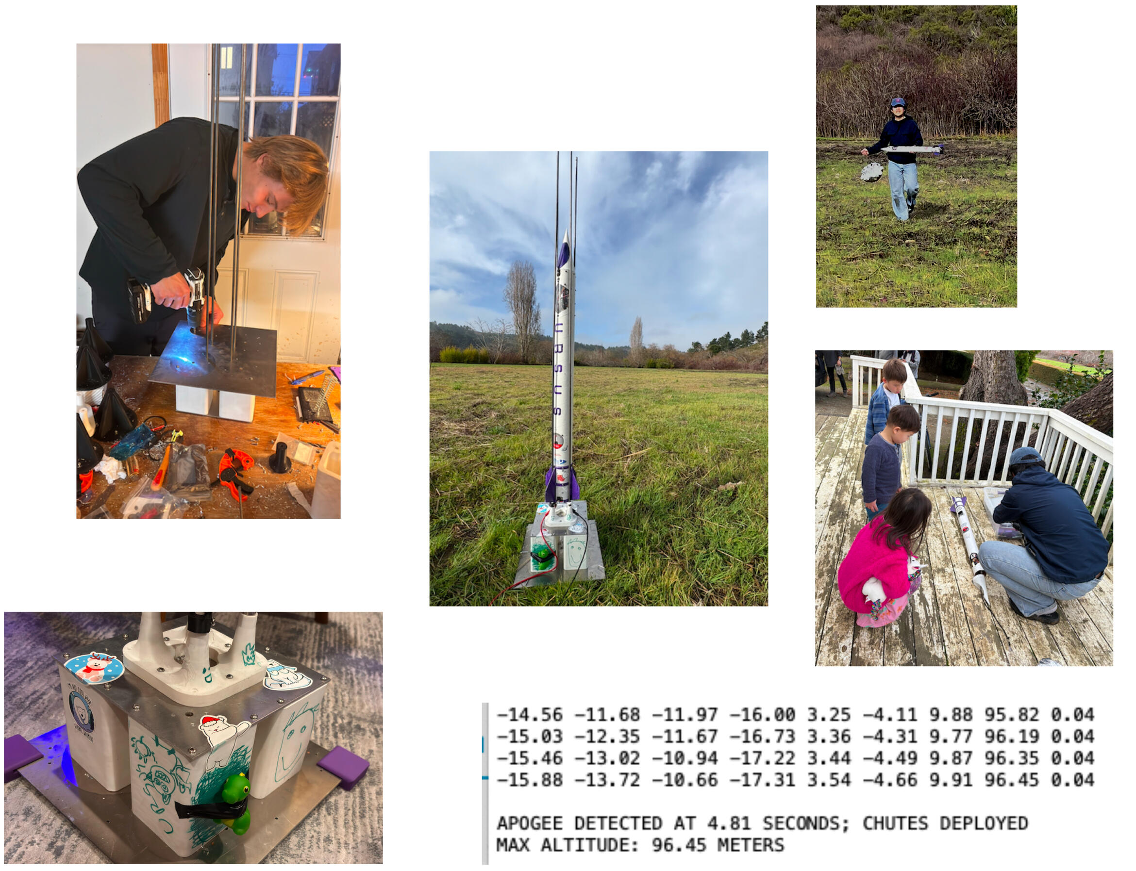 Immediately after Ursus landed, I sprinted over. I remember having mud all over my pants, but being pumped after seeing Ursus and its data were safe. The flight data at apogee (bottom right) shows a measured max altitude of close to 100m, below the OpenRocket 128m estimate. Apogee occurred at 4.81 seconds, which is when the parachutes deployed. This was earlier than the OpenRocket estimate of 5.2 seconds, but predicted by a pressure sensor in the flight computer, which observed the increase in altitude start to slow. The parachute would've deployed at 5.2 seconds regardless.Standing top left is my friend Alex Bozinovic, who helped me assemble a base I designed out of sturdy aluminum, steel guide rods, and 3D-printed supports. I had scouted the launch location previously, noting that I could use tent stakes to hold the base sturdy. Above bottom right contains some curious extended family members who showed up to watch the launch.